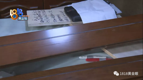 此外之外,電視護(hù)墻的反面有紅色石膏的蹤跡,他說此前撬開過一點(diǎn),發(fā)掘有拼接蹤跡。現(xiàn)場又用螺絲刀演示了一下,撬下了部分木頭屑。
