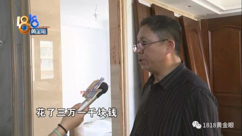 陳老師:“這個門送過來,發(fā)掘問題了,就這個門整個開裂的,門上面裂開以下裂開,都有問題的,門的邊框板油漆整個起泡的,護(hù)墻就是爛的,用爛板做的,(原本)理應(yīng)是高質(zhì)木門高質(zhì)材質(zhì) 。”