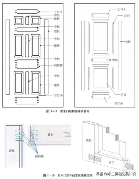 實木門全面構(gòu)造并且常見的部件連通方法見圖11-14,圖11一15所示。