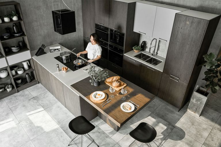 工字形廚房,廚房半島與餐桌和定制照明相結合,不僅有助于促進放松,還可以減少照射在居住者臉上的光線,將注意力吸引到食物上。如果沒有足夠的光線,即使是精心設計的房間也會顯得沒有吸引力和乏味。