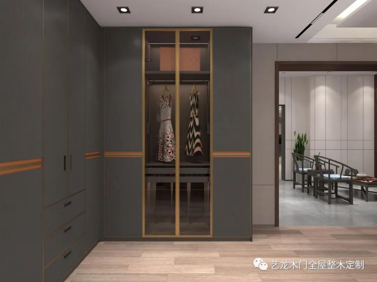 一般透明玻璃柜門,可以選擇茶色玻璃、灰色玻璃,避免了視覺上的凌亂,假如使用玻璃柜門,小編建議衣柜內(nèi)部最好多規(guī)劃掛衣區(qū),看起來更加具有視覺效果。
